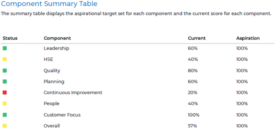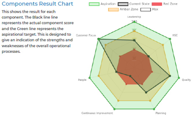 The overall assessment result has positioned the operation within the Amber zone. This indicates that each of the components has achieved a standard that will maintain the business at current performance levels and are sufficiently developed to control operating costs and meet customer expectations in the short term. However, in four of the seven components there were major areas of risk which would need significant and immediate investment.