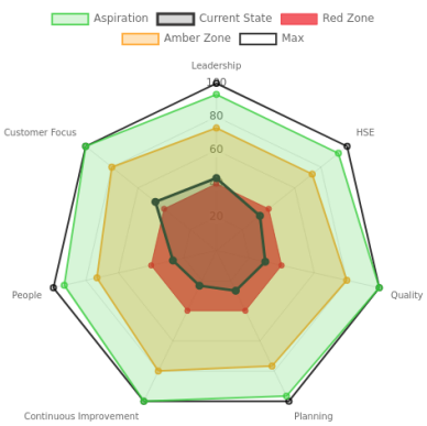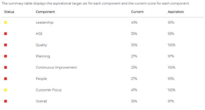 The overall assessment result positioned the operation within the Red Zone. This indicates that the processes required for a sustainable manufacturing operation do not exist or are failing to perform at an acceptable level. Of the seven components assessed, five were in the Red Zone representing a significant risk to the business. The other two only just made the Amber Zone.