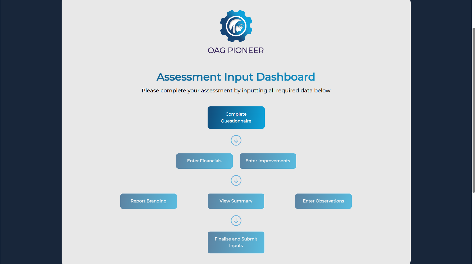 When you purchase a Pioneer Assessment, you will be taken to the ‘Assessment Input Dashboard’ which remains ‘Live’ until the assessment has been finalised and submitted. This dashboard controls the data input sequence starting with ‘Complete Questionnaire’. Each button turns green once the data entry is completed. When all the buttons, except the ‘Finalise and Submit Inputs’ button, are green, ‘View Summary’ is enabled to check the data that has been input. When you are satisfied that all the information is correct, select ‘Finalise and Submit Inputs’ to view and download your reports.